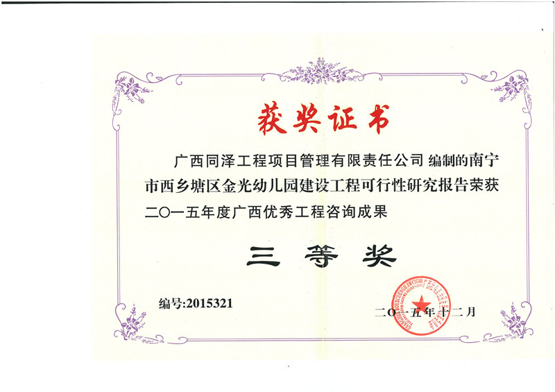 南寧市西鄉塘區金光幼兒園建設工程可行行研究報告榮獲2015年度廣西優秀工程咨詢成果三等獎