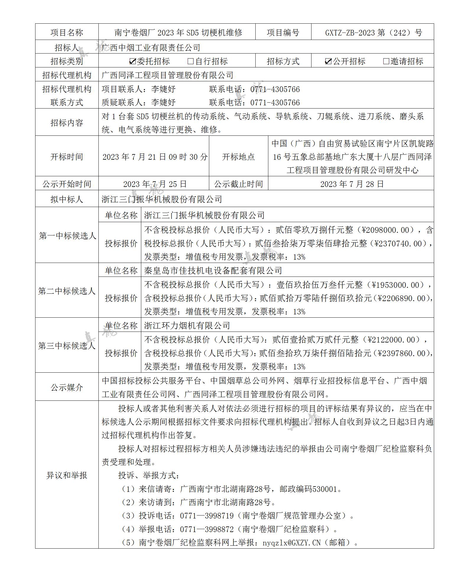 廣西中煙工業有限責任公司南寧卷煙廠2023年SD5切梗機維修(項目編號:GXTZ-ZB-2023第(242)號)中標候選人公示