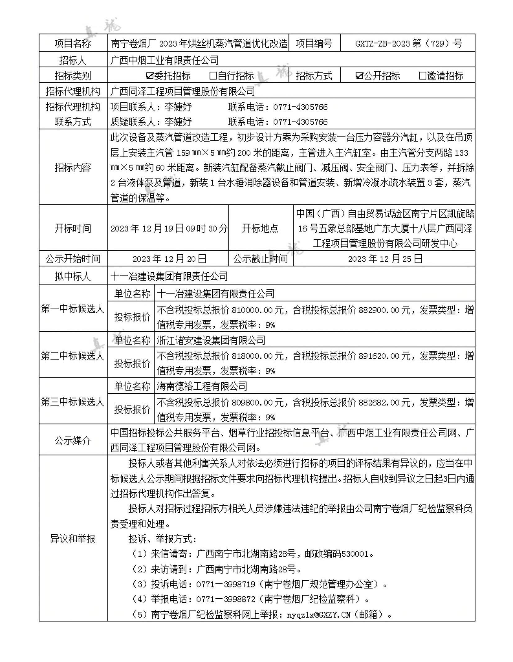 廣西中煙工業有限責任公司南寧卷煙廠2023年烘絲機蒸汽管道優化改造(項目編號:GXTZ-ZB-2023第(729)號)中標候選人公示