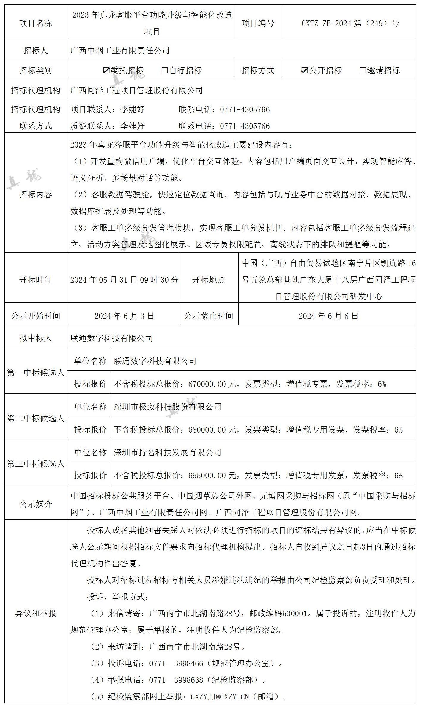 廣西中煙工業有限責任公司2023年真龍客服平臺功能升級與智能化改造項目(項目編號:GXTZ-ZB-2024第(249)號)中標候選人公示