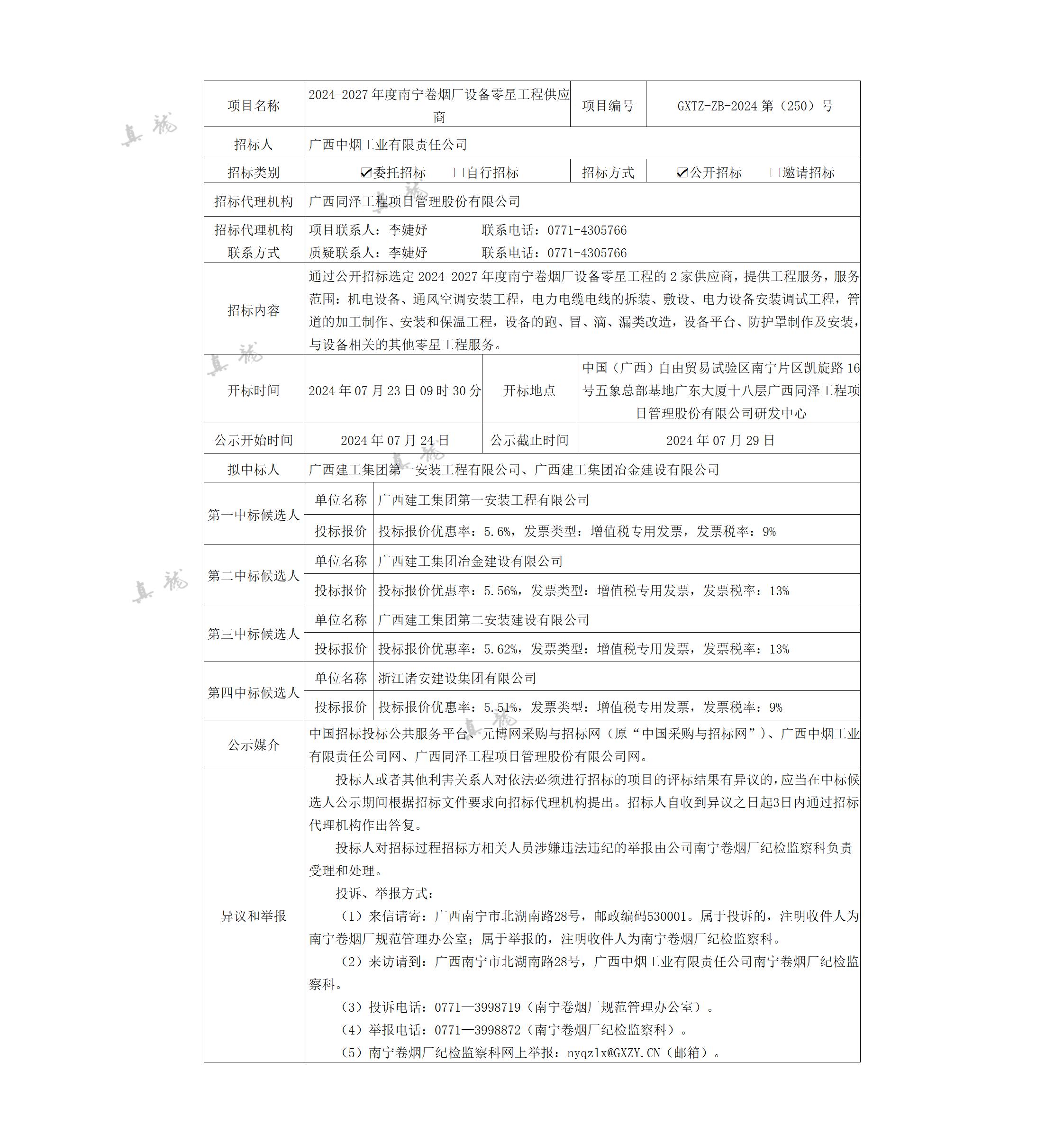 廣西中煙工業(yè)有限責(zé)任公司2024-2027年度南寧卷煙廠設(shè)備零星工程供應(yīng)商(項(xiàng)目編號(hào):GXTZ-ZB-2024第(250)號(hào))中標(biāo)候選人公示