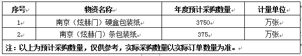 4、南京(炫赫門)硬盒包裝紙不含稅中標價:1001.7550元/萬張,南京(炫赫門)條包裝紙不含稅中標價:4326.5550元/萬張,發票類型:增值稅專用發票,發票稅率:13%。