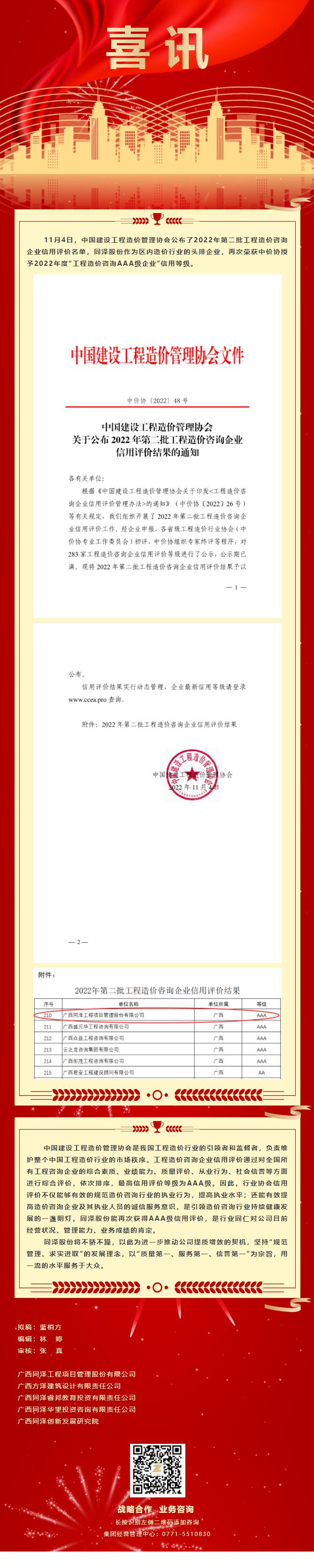 喜訊丨同澤股份榮獲中價協(xié)授予2022年度“工程造價咨詢AAA級企業(yè)”信用等級